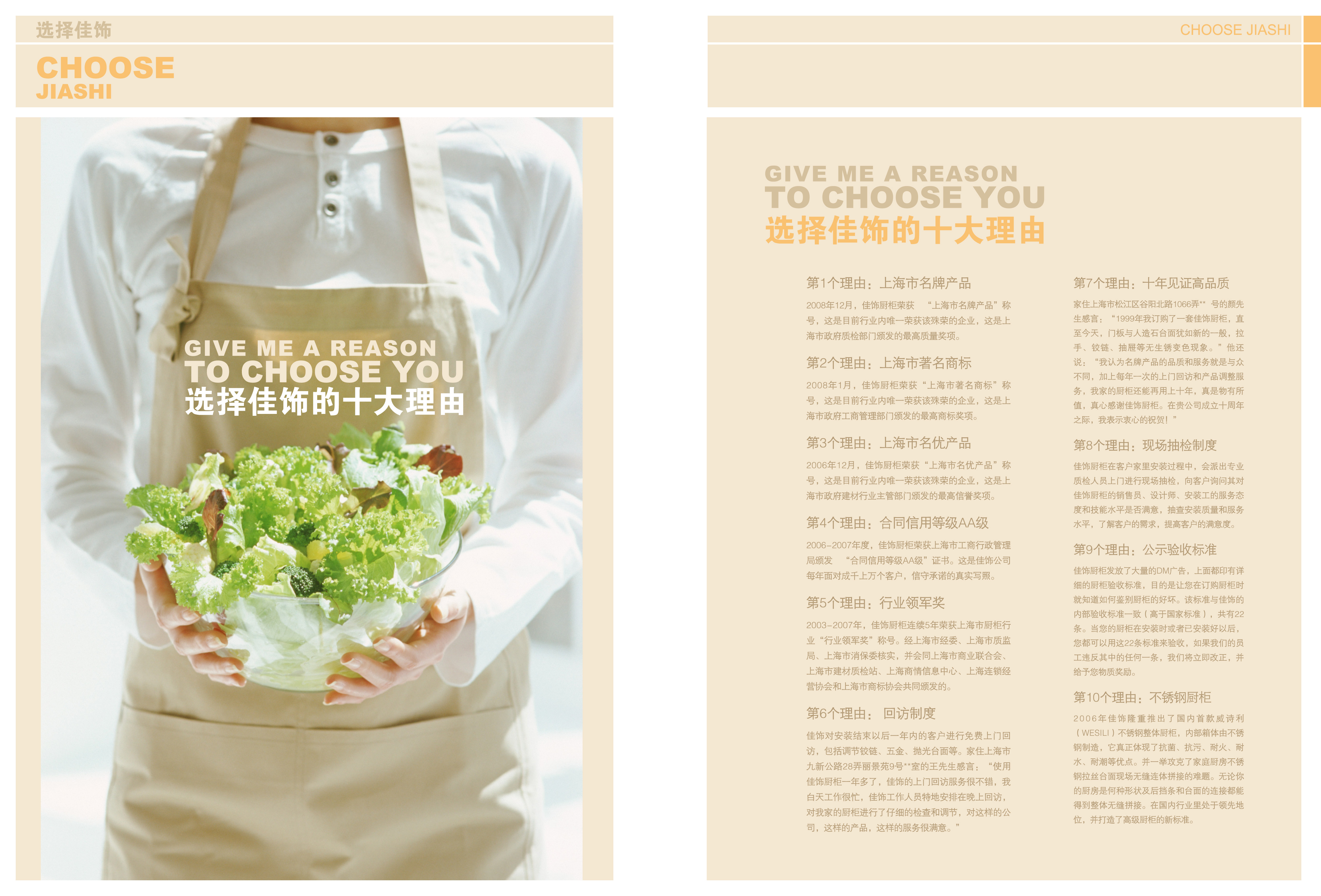 公司2002年即通過了 ISO 9001質(zhì)量體系認(rèn)證,2015年通過了ISO14001環(huán)境管理體系;多年連續(xù)榮獲“上海市名牌”、“上海市著名商標(biāo)”、“上海市名優(yōu)產(chǎn)品”等榮譽(yù);且常年擔(dān)任行業(yè)會(huì)長(zhǎng)、副會(huì)長(zhǎng)職務(wù)。無論是與歐美同步新品廚柜的誕生,還是經(jīng)濟(jì)實(shí)用型廚柜的普及,佳飾都走在行業(yè)的前列。