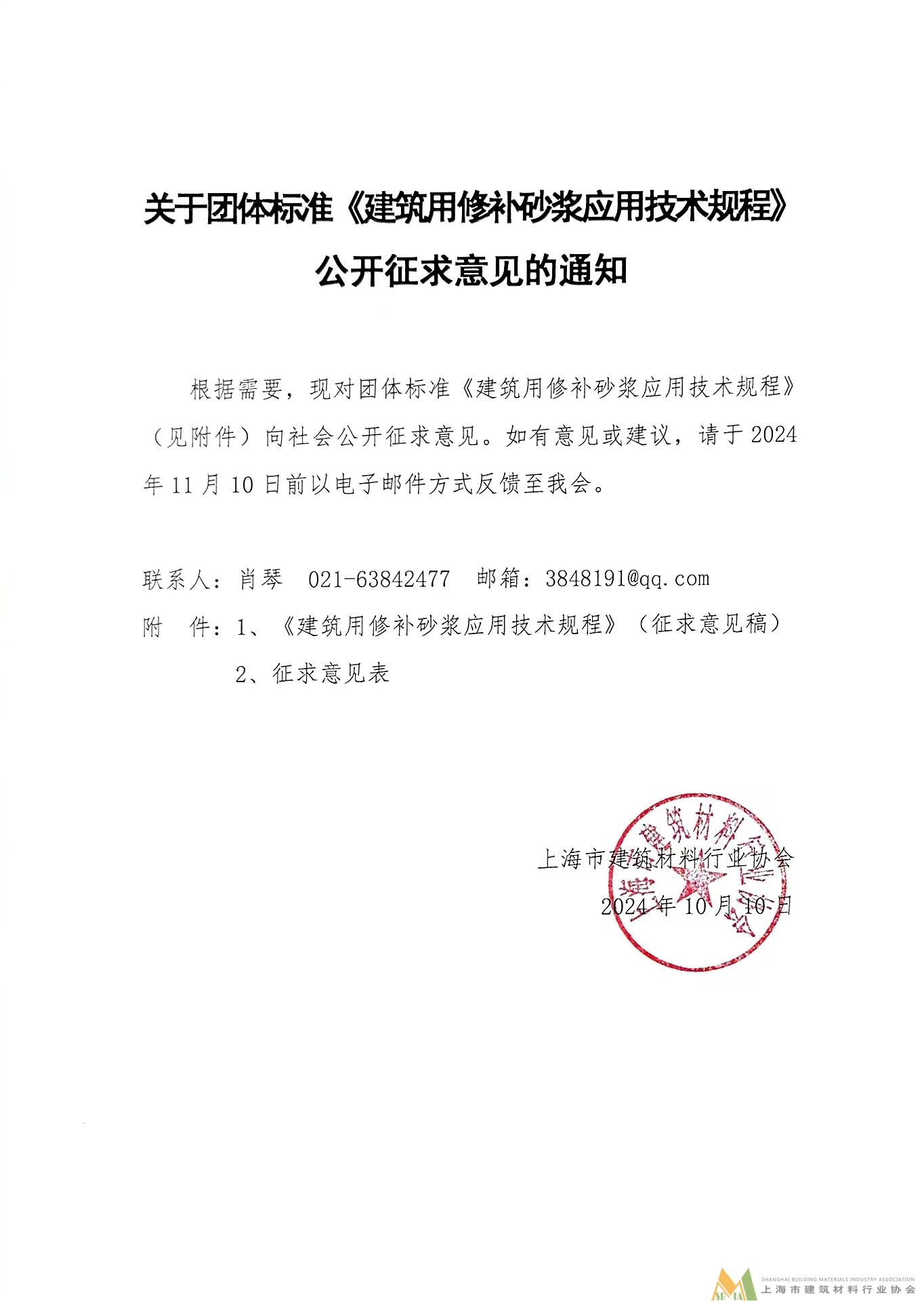 關(guān)于《建筑用修補(bǔ)砂漿應(yīng)用技術(shù)規(guī)程》公開(kāi)征求意見(jiàn)的通知